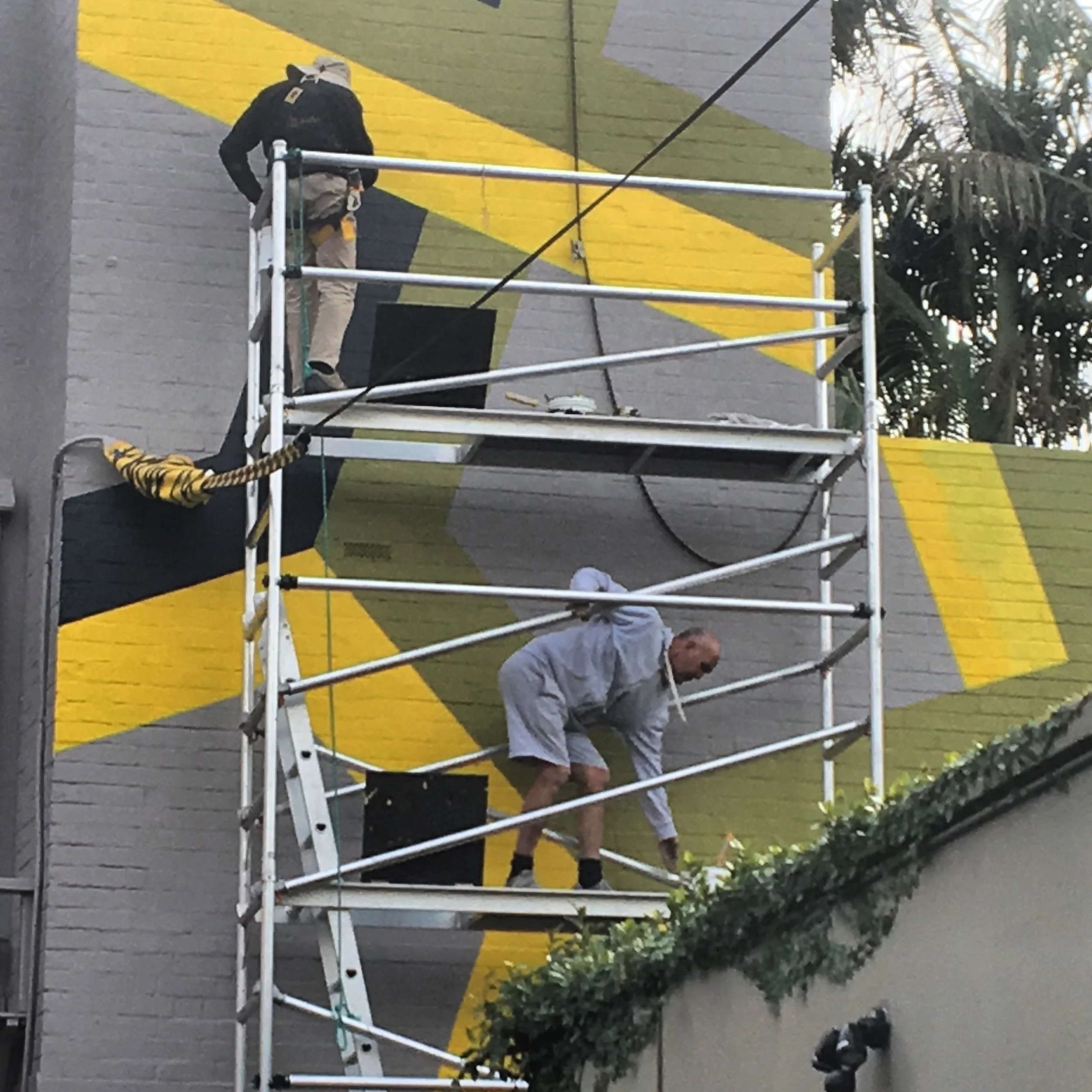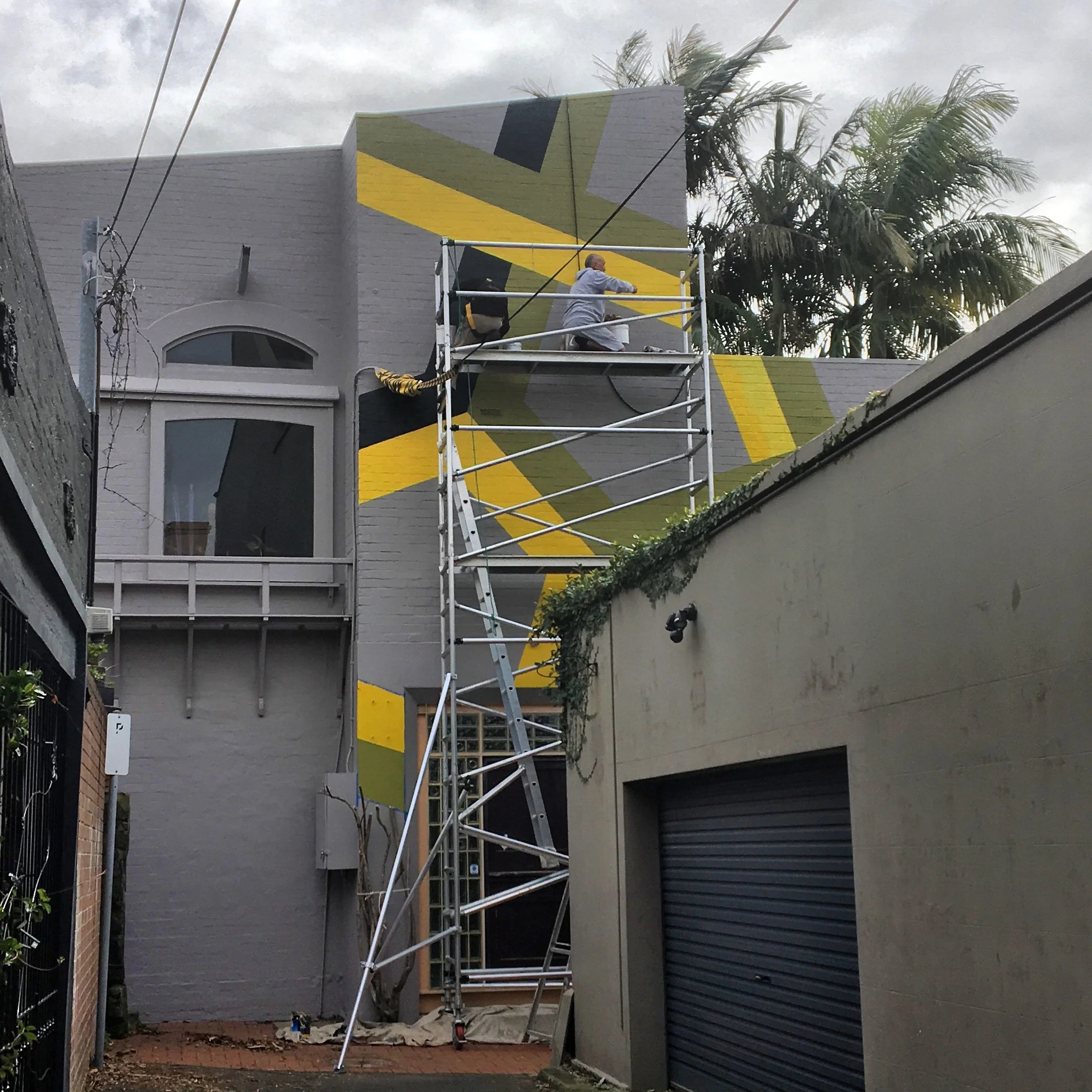 Shelley Indyk has commissioned and collaborated with Claudia Damichi -artist- on the mural for Begg lane studio. Mural was painted on external walls during August-September 2016 by Paintsmiths and Claudia Damichi. The mural wraps the studio building and palm tree courtyard in patterning bands of colour: Dulux Fluffy Duckling, Dulux Antactic Deep, Dulux Apeland with the background wall colour in Dulux Mouse Catcher….as we write…
