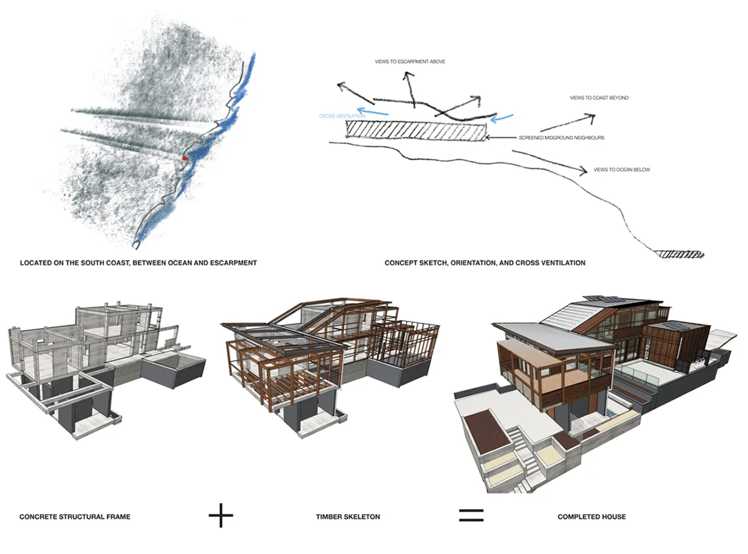 All bespoke house projects start with sketching of place and context and concepts... Massing models are created within the 3D CAD program of Archicad and ideas are tested through the CAD program.